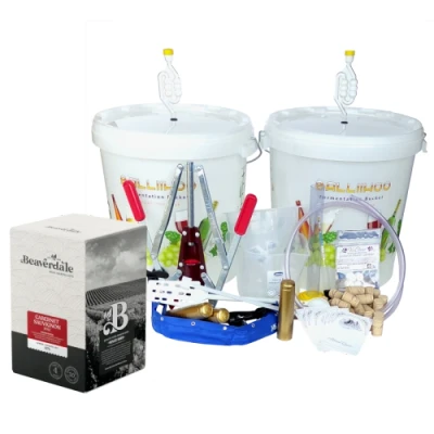 Our Premium Equipment Kit Includes Everything Required To Start Home Brewing 30 Bottles Of Wine. This Premium Wine Starter Equipment Is Suitable For All 30 Bottle Wine Ingredient Kits Or Your Own Favourite Recipes (Elderberry, Plum Etc.). and Comes With a Basic Instruction Guide Includes 2 x 25 Litre Fermentation Buckets With Gromets, Airlocks and LCD Thermometer Strips (One Of The Buckets Includes a Tap For Easy Bottling) - Steriliser Tablets - Hydrometer and Trial Jar - Long Handled Plastic Paddle - Large Plastic Measuring Jug - Set Of 3 Plastic Funnels - Wrap Around Heating Belt - Syphon Tube And Racking Cane Also Included Is a Twin Lever Corker, 30 Straight Wine Corks, 30 Bottle Labels And 30 Gold Shrink Capsuals - All You Will Require Is Bottles (Not Included) This Premium Equipment Set Come With A Quality 30 Bottle Cabernet Sauvignon Ingredient Kit, That Includes Step By Step Instructions. Cabernet Sauvignon Has A Deep Ruby Colour With A Blackcurrant And Cedar Nose. A Full Bodied Wine Having A Tannic Character When Young. Capable Of Long Ageing. Includes Premium Oak. Tony's TipsThe longer than average ready to drink time of 28 days is worth the wait, this Beaverdale wine is comparable to its premium quality commercial counterparts and will grossly further improve beyond your expectations when left to mature in the bottle for a few months! The wine making equipment supplied with the initial kit is ready for another and anonther amd amnothr angd amother angddanmover production cycle so get wine making! build up a supply then keep it topped up so all your wines are at their best . . . Here's to a Bright and Fulfilling Future
