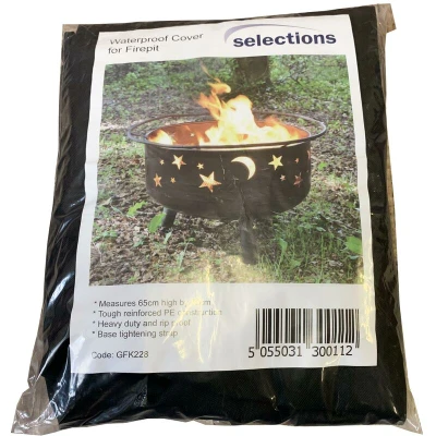 General description Designed to cover the Selections Sun and Moon Firepit, this Premium Firepit Cover is suitable for any firepit with similar dimensions. Made from durable black polyester, it offers protection against the elements. Technical specifications Height: 65 cm Width: 75 cm Material: Hardwearing black polyester Compatibility and accessories Compatible with Selections Sun and Moon Firepit and other firepits with similar dimensions Includes adjustable fixing cord