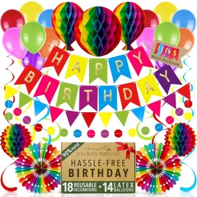 STRESS-FREE BIRTHDAY MAGIC - Brighten up any space and every face with this ample set of 32 rainbow birthday decorations. It assembles quickly with ingenious Velcro fasteners and includes everything you need, even paper raffia ribbon. MULTI-OCCASION BANNER - Includes bonus letters so you can customise the message to say: Happy Birthday, Party Day, Happy Easter, or Happy New Year. EXCEPTIONAL VALUE - Everything except the balloons is reusable. Just undo the Velcro, store flat in the handy box, and reuse for birthdays or parties. 90% PAPER, 9% LATEX - The balloons are made from natural latex. Everything else is made from paper. Our packaging is 100% paper. Our mission is to reduce party decor waste. THE FACTS - UK-designed, prioritising quality and sustainability. This colourful party pack includes: 14 x latex balloons, 1 x multi-occasion banner, 1 x mini bunting, 1 x paper garland, 8 x streamers, and 7 x 3D honeycomb paper decorations (1 x ball, 2 x balloons, 2 x fuzzy balls, 2 x disks)., Manufacturer: DoWant!
