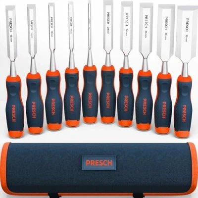 Everything included: The wood chisel set contains 10 high-quality chisels (6, 10, 12, 16, 18, 20, 24, 26, 32, 38 mm) for precise woodworking and a bag. Perfect for professionals. Unpack and get started: Your new chisel set comes fully polished and ready to use. This allows you to start immediately without spending time polishing. Precise: The particularly ergonomic handles and the high-quality steel characterize this wood chisel set. They are extremely precisely polished for exact carving and simultaneously very hard for heavy-duty chiseling. Optimal angle: Each chisel has a precisely ground 25° edge. Ideal for consistently performing accurate carving or chiseling tasks. Striking cap for hammer blows: The metal striking cap protects the handle when working with a wooden mallet. Perfect for carpentry and woodworking tasks.