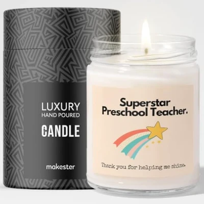 Superstar Preschool Teacher. Thank you for helping me shine. Quality Over Everything - We've scoured every nook, cranny, and soybean field to get the top-shelf stuff for our candle - the kind of wax and essential oils that would make a candle connoisseur weep with joy. Fresh Fragrance - A captivating aroma made from natural essential oils and a blend of sugared almond, vanilla, and white musk. It's (probably) the best-smelling candle in the world. Great Size, Unforgettable Glow - 220g of high-quality soy wax ensures that this candle will keep on going and going. Enjoy over 40+ hours of uninterrupted candle pleasure.