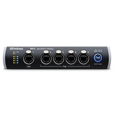 5 AVB ETHERCON jacks; 4 ports with pole Pole power indicators and on/off switch Network Link/activity indicators Rack mountable (screws to a rack tray) Internal power supply with IEC connector and power switch