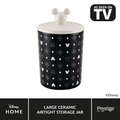 If you're a fan of Disney's Mickey Mouse, you'll love these Ceramic airtight storage jars from the Disney Monochrome collection from Prestige, kitchenware designed to make ordinary moments feel extraordinary. Add a dash of wonder to everyday cooking with the timeless aesthetic of Disney's early-era black-and-white animated masterpieces. These fun storage cannisters feature a black and white Mickey Mouse print and an iconic Mickey Mouse shaped handle. Ideal gift for Disney fans and cooking enthusiasts! Airtight storage containers with a silicone seal lid - ideal for storing dry goods Easy to grip 3D Mickey Mouse knob handle Made from a glazed Ceramic with an elegant monochrome Mickey Mouse print Dishwasher safe for easy cleaning Small, Medium and Large jars available as a set of three, or individually. Large: 13.7cm diameter and 22.6cm height Medium: 13.7cm diameter and 14.6cm height Small: 10cm diameter and 15cm height