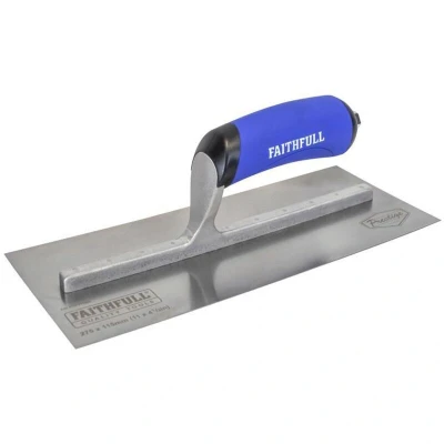 General description This Faithfull Prestige Plastering Trowel is designed for the smooth and easy application of plaster, making it suitable for both professional and DIY use. The high-grade stainless steel blade features pre-worn edges that mimic a well-used tool, preventing the leading edge from digging into the material. Its lightweight yet durable construction, combined with an ergonomic 'camel back' handle, ensures comfort during extended use, while the arched shape provides extra knuckle clearance for better handling. Technical specifications Blade size: 275 x 115 mm (11 x 4.1/2 inches) Blade thickness: 0.6 mm Material: Stainless steel blade, aluminum shank Handle: Ergonomic, soft grip with 'camel back' shape Compatibility and accessories Compatible with various plastering compounds and finishing materials Can be used with other plastering tools for professional results Installation No installation required; ready to use out of the box. Usage Apply plaster smoothly onto surfaces