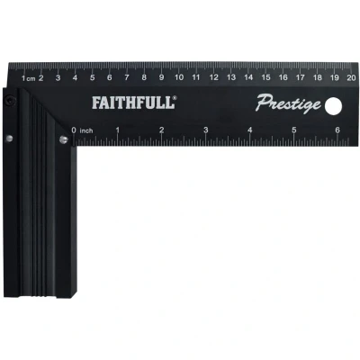 General description The Faithfull Prestige Black Aluminum Try Square is a precision measuring tool designed for marking and checking right angles in woodworking and metalworking. It features a durable aluminum construction with high accuracy CNC machining, ensuring reliable performance. The black anodized finish provides corrosion and scratch resistance, while the laser-engraved gauge allows for clear readings. Technical specifications Material: Aluminum Length: 200mm (8 inches) Finish: Black anodized Measurement units: Metric and imperial (ruled markings) Manufactured with high precision CNC machining Compatibility and accessories Compatible with standard woodworking and metalworking tools requiring precise angle measurements Includes a laser-engraved gauge for accurate readings Installation No installation required; ready to use out of the box Usage Use for marking out 90° angles on workpieces Check the squareness of edges and corners Ensure accurate measurements with the clear,