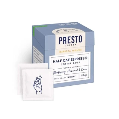 Presto Coffee Half Caf Espresso Bags, 80g Dark Roast, Caffeine Balanced Flavor in Convenient Single Serve Bags
