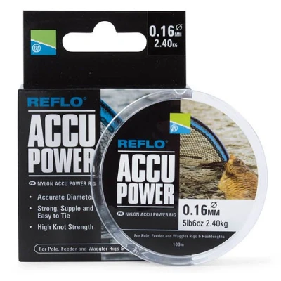 Preston Battery Power - Number of metres per spool: 100m - Extremely durable monofilament - Very accurate - Super strong material - Supple - Easy to tie knots - Very strong knots A super high-tech line made from an extremely durable monofilament. Accu Power lives up to its name and each diameter accurately matches the specified size, making Accu Power the ideal choice for rigs and leaders. Features of this line are its flexibility and very strong knots. Available in sizes from 0.07mm to 0.22mm, there is a suitable diameter available for every discipline, whether it is commercial carp fishing or roach fishing.