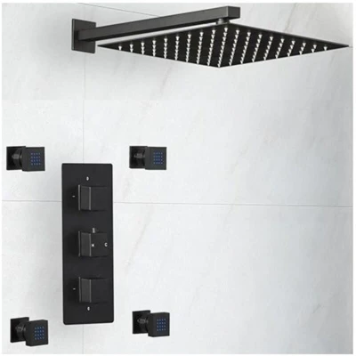Preto Modern 2 Outlet Triple Thermostatic Mixer Shower Valve with 300mm Wall Mounted Square Rainfall Head and Four Body Jets Black Milano