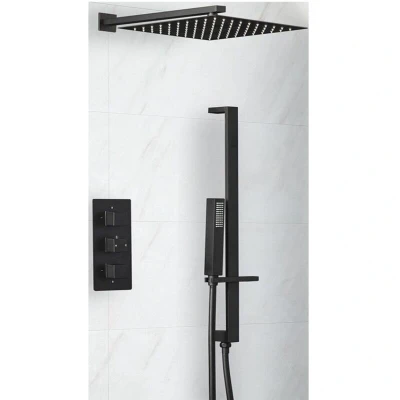 General description Combine modern style and showering comfort with the matte black Milano Preto two outlet shower system, which includes a triple thermostatic shower valve, a 300mm wall-mounted square shower head, and a slide rail kit. The anti-corrosive stainless steel shower head provides a luxurious rainfall effect, while the slide rail kit features an ABS hand shower for a refreshing water spray. The slide rail allows for perfect positioning of the hand shower, accommodating users of different sizes. Technical specifications Shower head size: 300mm Minimum recommended pressure: 1.0 bar Material: Anti-corrosive stainless steel and solid brass Finish: Matte black powder coated Compatibility and accessories Compatible with all types of plumbing systems Slide rail kit includes: ABS hand shower, hose, outlet elbow, and slide rail Installation Wall-mounted installation Usage Thermostatic control for accurate temperature and flow adjustment Can operate both outlets simultaneously or