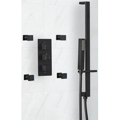 Preto Modern 2 Outlet Triple Thermostatic Mixer Shower Valve with Hand Handset Slide Rail Kit and Four Body Jets Black Milano