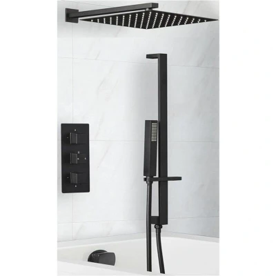General description Create a luxurious bathing and showering experience with the matte black Milano Preto three outlet system, which includes a triple diverter thermostatic valve, wall-mounted square shower head, slide rail kit, and overflow bath filler. Technical specifications Material: Solid brass valve and anti-corrosive stainless steel shower head Shower head size: 300mm square Minimum recommended pressure: 1.0 bar Overflow bath filler suitable for baths up to 15mm thick Finish: Matte black powder coated Compatibility and accessories Compatible with all types of plumbing systems Slide rail kit includes ABS hand shower, hose, outlet elbow, and slide rail Installation Wall-mounted installation for shower head and overflow bath filler Usage Multi-function shower can operate two of the three outlets simultaneously Thermostatic control prevents sudden changes in temperature Ergonomic square handles for intuitive use Silicone nozzles for easy cleaning and removal of limescale Other