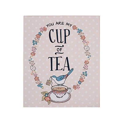 General description This wall plaque features a gentle pink finish with white polka dots, creating a cheerful impression. The endearing "you are my cup of tea" message is surrounded by a delightful array of flowers, complemented by a friendly bird perched on an inviting cup of tea below. Technical specifications Material: Durable and lightweight MDF Color: Pink with white polka dots Installation Includes a metal hook on the back for easy display on the kitchen wall.