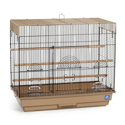 Designed for Parakeets, Cockatiels and other small birds Includes 2 plastic hooded cups and 2 wood perches Removable bottom grille and pull out tray for easy cleaning Large, front opening door 26-inch long, 14-inch wide, 20-inch high with 1/2-inch wire spacing