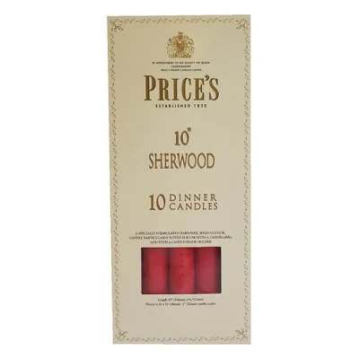 Enhance your décor with the 10 Sherwood Red Candles – Pack of 10. Classic taper design with a rich green hue, perfect for holiday settings, special occasions, or everyday elegance.Candle Height : 250 mm, Candle Diameter : 22 mmBurn Time : 9 hours.The Sherwood dinner candle was designed and created by Price's in the 1830's. It was selected by Princess Victoria for her wedding to Prince Albert in 1840 and is still used by the British Royal Household for State occasions.Prices 10 Sherwood Candles are available in various colours as a pack of 10.