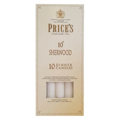 Enhance your décor with the 10 Sherwood White Candles – Pack of 10. Classic taper design with a rich green hue, perfect for holiday settings, special occasions, or everyday elegance.Candle Height : 250 mm, Candle Diameter : 22 mmBurn Time : 9 hours.The Sherwood dinner candle was designed and created by Price's in the 1830's. It was selected by Princess Victoria for her wedding to Prince Albert in 1840 and is still used by the British Royal Household for State occasions.Prices 10 Sherwood Candles are available in various colours as a pack of 10.