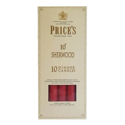 Enhance your décor with the 10 Sherwood Wine Red Candles – Pack of 10. Classic taper design with a rich green hue, perfect for holiday settings, special occasions, or everyday elegance.Candle Height : 250 mm, Candle Diameter : 22 mmBurn Time : 9 hours.The Sherwood dinner candle was designed and created by Price's in the 1830's. It was selected by Princess Victoria for her wedding to Prince Albert in 1840 and is still used by the British Royal Household for State occasions.Prices 10 Sherwood Candles are available in various colours as a pack of 10.