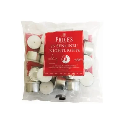 The Prices Sentinel Nightlights Pack of 25 high quality white wax nightlights are long burning, giving up to eight hours of burn time. Perfect for dinner parties and other occasions when four hours isn't long enough! Each Sentinel Nightlight measures 4cm in diameter and 2.2cm high.