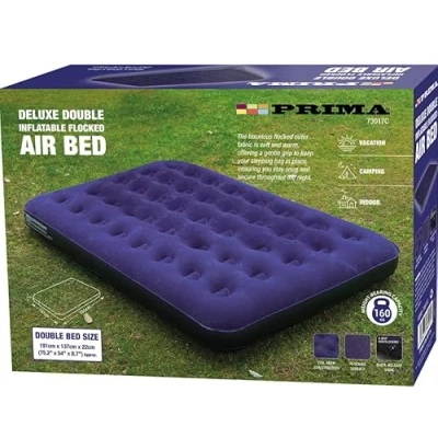 COMFORTABLE & SUPPORTIVE: The Prima Double Inflatable Air Bed is designed with a soft flocked surface for extra comfort and a cozy sleeping experience. DURABLE & LEAK-RESISTANT: Made from high-quality, puncture-resistant PVC, ensuring long-lasting durability and air retention throughout the night. QUICK & EASY INFLATION: Compatible with manual or electric air pumps (pump not included), allowing for fast inflation and deflation within minutes. VERSATILE USE: Ideal for camping, guest beds, sleepovers, and travel, providing a comfortable sleeping solution anywhere. COMPACT & PORTABLE: Deflates easily for compact storage and transportation, making it a great space-saving option.