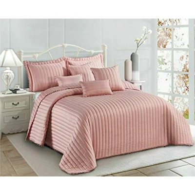 PACKAGE CONTAIN: Our Pom Pom Quilted Bedspread Set Double 3 Piece (1 x Bedspread + 2 Pillow Shams). Double Bedspread is 250 cm wide and 250 cm Long and Pillow covers are standard size with an extra 5 cm decorative border. CLASSIC DESIGN: The pom pom quilt set features a classic stripe pattern with pom pom at the borders. Solid color bedding set with cute pom pom decor quilt bed throw, suitable for all style room decoration for all seasons. Give your bedroom a fresh modern look with this pom-pom bedspread set. MULTI-PURPOSE USAGE ALL SEASON: The bed coverlet is made of 100% microfiber and filled with polyester. This lightweight bedspread is suitable for all seasons. You can use it as a bed cover if you like to sleep with your pet or keep warm in the cold season. At the same time, in the warm season, you can use it as a quilt. AMAZING COLORS: Our bedspreads are available in several fantastic colors. Now doesn't that make for the perfect gift or complement for your home? EASY CARE: The quilt set is easy to clean and does not fade easily. Machine wash cold, tumble dry, no bleach required. Remains soft after multiple washes