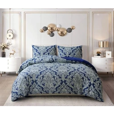 Prime Linens Duvet Cover Set 3 Pcs Polyester Cotton Quilt Bedding With Pillow Cases and Extra Fitted Sheet Included (Damask Blue, Single)