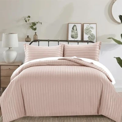 PRIME LINENS Duvet Cover Set Satin Stripes Quilt Bedding Sets with Pillowcases Hotel Quality Ultra Soft Hypoallergenic Machine Washable (Pink, King)