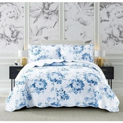 Prime Linens Luxury 2 Piece Quilted Printed Bedspread Set Throw Bedding Includes Soft Bed Comforter with 1 Pillow Sham Embroidered Machine Wash (Vintage Floral Blue, Single)