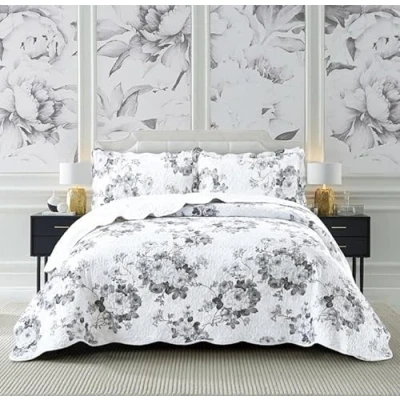 Prime Linens Luxury 2 Piece Quilted Printed Bedspread Set Throw Bedding Includes Soft Bed Comforter with 1 Pillow Sham Embroidered Machine Wash (Vintage Floral Grey, Single)