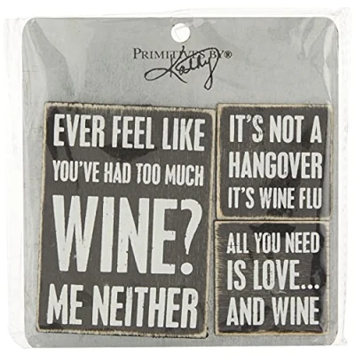 FUNNY FRIDGE MAGNETS: Wood magnets with funny wine quotes for the wine lovers in your life 3 PIECE SET: Large magnet measures 3 x 4-inches, 2 smaller pieces measure 2 x 2-inches FOR THE WINE LOVER: "Ever Feel Like You've Had Too Much Wine? Me Neither," "It's Not A Hangover - It's Wine Flue," and "All You Need Is Love... And Wine" DISTRESSED STYLE: Classic Primitives by Kathy - black and white with sanding on surfaces, with rounded edges and corners SAY IT WITH SASS: Hilarious, sarcastic or heartwarming - Primitives by Kathy has just the right gift to tell them how you really feel, Manufacturer: Primitives By Kathy