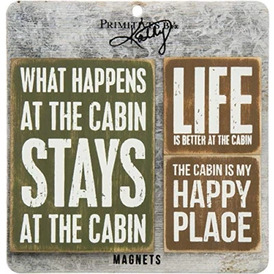 CABIN FRIDGE MAGNETS: Wood magnets with cabin themed quotes that remind you of your happy place 3 PIECE SET: Large magnet measures 3 x 4-inches, 2 smaller pieces measure 2 x 2-inches FOR THE OUTDOOR LOVER: "What Happens At The Cabin Stays At The Cabin," "Life Is Better At The Cabin," and "The cabin Is My Happy Place" DISTRESSED STYLE: Classic Primitives by Kathy box sign lettering, nature inspired palette, sanding on surfaces, with rounded edges and corners SAY IT WITH SASS: Hilarious, sarcastic or heartwarming - Primitives by Kathy has just the right gift to tell them how you really feel, Weight: 0.02 Pounds, Manufacturer: Primitives By Kathy