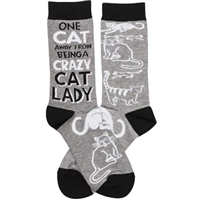 PRIMITIVES BY KATHY SOCKS: Fun novelty socks made from a comfy and long-wearing blend of cotton, nylon and spandex ADULT SIZE: One size fits most COLORFULLY PRINTED SOCKS featuring a "One Cat Away From Being A Crazy Cat Lady" with cat design FOR THE CAT LOVER: Search for feline-themed box signs, coffee cups, dish towels, and more from Primitives by Kathy SAY IT WITH SASS: Hilarious, sarcastic or heartwarming - Primitives by Kathy has just the right gift to tell them how you really feel