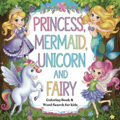 Princess, Mermaid, Unicorn and Fairy: Magical Coloring Book & Word Search puzzle for Kids Ages 3 4 5 6 7