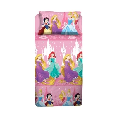 Princess Single Bed Sheet Set, Disney Top Sheet, Fitted Pillowcase, Pink, Disney, 100% Cotton, Official Product