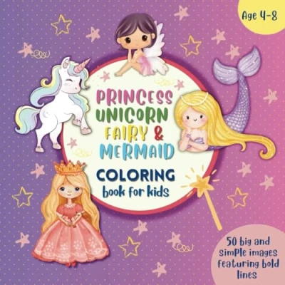 Princess, Unicorn, Fairy and Mermaid: Coloring Book for Kids Ages 4 8, Cute, magical Easy