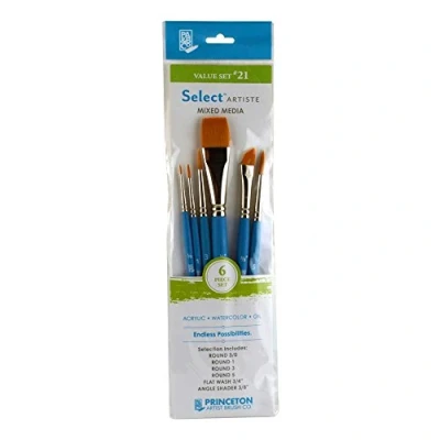 PRINCETON’S BEST-SELLING BRUSH - Whether you're painting with acrylic, oil or watercolour, Select Artiste brushes are perfect for all of your arts and crafts needs. Now, you can explore traditional and avant-garde techniques on nearly any surface. BEAUTIFULLY DESIGNED - Satin-finished, jewel-tone blue handles and silver ferrules make our brushes as beautiful to look at as they are to paint with MULTIPLE FILAMENT TYPES - Filament types vary based on the paintbrush style. Our bristles are thoughtfully designed using a variety of synthetic hair THE MOST COMPLETE ASSORTMENT - Select Artiste brushes are offered in 29 distinct shapes and 108 individual styles, including flats, shaders, rounds, fan, daggers, filberts, washes, liners and more. Contains: Angle Shader 3/8 Inch, Flat Wash 3/4 Inch, Round 3/0, Round 1, Round 3, Round 5