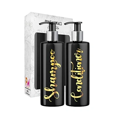 Print Maniacs 2 Set Mrs Hinch Inspired Black Personalised Dispenser Pump Bottles Shampoo Conditioner (Gold)