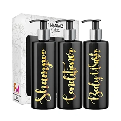 Print Maniacs 3 Set Mrs Hinch Inspired Black Personalised Dispenser Pump Bottles Shampoo Conditioner Body Wash (Gold)