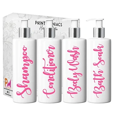 Print Maniacs Mrs Hinch Inspired White Personalised Pump Bottles Bathroom Kitchen Set Shampoo Conditioner (Baby Pink)