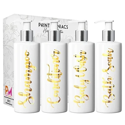 Print Maniacs Mrs Hinch Inspired White Personalised Pump Bottles Bathroom Kitchen Set Shampoo Conditioner (Gold)