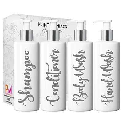 Print Maniacs Mrs Hinch Inspired White Personalised Pump Bottles Bathroom Kitchen Set Shampoo Conditioner (Grey)