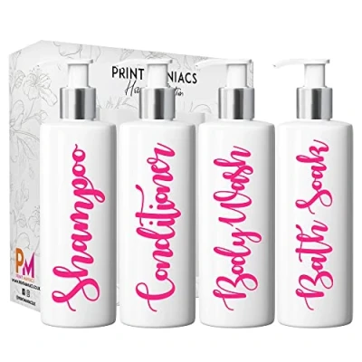 Print Maniacs Mrs Hinch Inspired White Personalised Pump Bottles Bathroom Kitchen Set Shampoo Conditioner (Pink)