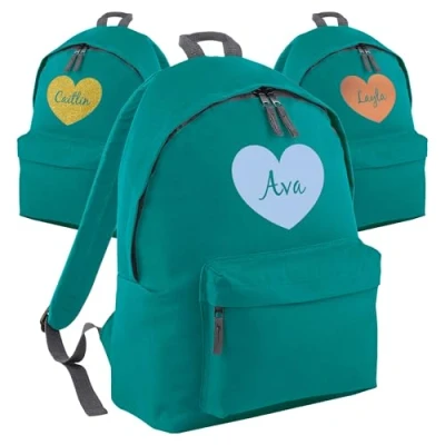 Print Maniacs Personalised Backpack School Large 18L Kids Travel Rucksack Junior Shoulder Collage Back To Girls Boys P.E Laptop Book Bag Heart (Emerald)