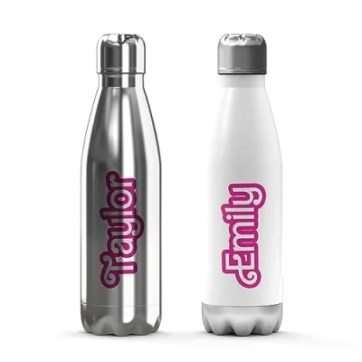 2 COLOURS AVAILABLE: Eight eye catching coloured bottles to choose from, whether this is a present for your water loving self, friend, child or niece and nephew, I'm sure they will want to display it with pride while they are around the lunch table, working out at the gym or playing in the football with their friends. This fashionable bottle meets all of your drinking needs. PERSONALISE: Struggling to find of a unique, reusable water bottle? Then look no further than our personalised coloured metal water bottles! Personalise with any name of your choice up to 15 characters long. LIGHTWEIGHT: Ideal for Indoor and Outdoor use. Suitable for day-to-day use, school, sports, cycling, football, gym, rugby, skating and more EASY TO CARRY: Perfect for daily use and can be taken to anywhere - hiking, biking, beach, camping, gym, school, yoga, sports or company! Put your portable sports water bottle in your gym bag, in the side pouch of your backpack or as your daily companion - keeping you health and hydrated GENEROUS CAPACITY: With a BPA Free coating, this bottle keeps water fresh and safe to drink! Holding up to 350ml or 500ml of your drink of choice, the perfect size to satisfy your thirst while small enough to take with you anywhere. ❗PLEASE NOTE❗ These bottles are hand wash only!