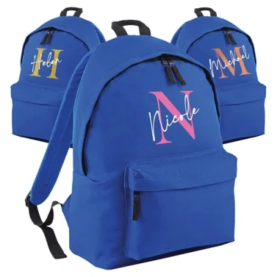Print Maniacs Personalised School Backpack Large 18L Kids Travel Rucksack Junior Shoulder Collage Back To Lunch Swimming P.E Laptop Book Bag Initial Name (Bright Royal, 18 Litre)