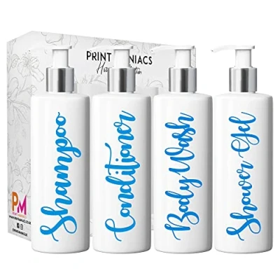 Print Maniacs White Mrs Hinch Inspired Personalised 500ml Pump Bottles Bathroom Lotion Kitchen Set Shampoo Conditioner (Shower Gel Set) (Blue)