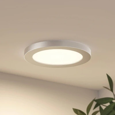 Round LED ceiling light Aureka, suitable for recessed and surface-mounted installation, CCT colour adjustment via DIP switch Aureka scores points with its multifunctional design and simple appearance. The LED ceiling light can be used as a discreet surface-mounted ceiling light, but can also be recessed into the ceiling if required and scores points with its shallow installation depth thanks to its very flat design. The light colour of the LEDs can also be adjusted before installation. A DIP switch is attached to the housing for this purpose and the wattage can also be preset in three stages using this switch. All of these features make the Aureka LED ceiling lamp a useful source of light, which is pleasantly discreet with its round shape and white surface and can be used both commercially and privately. The light is supplied with a silver ring-shaped decorative plate, which can optionally be magnetically attached to the light to change the design if required. Installation diameter: - Variant 1 (22.5 cm): 6.5 cm - 21 cm - Variant 2 (33 cm): 6.5 cm - 31 cm