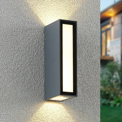 Lights.coDark Loriava LED outdoor wall light with multiple beam directions The Loriava LED outdoor wall light stands out from its surroundings in style thanks to its distinctive design. The angular die-cast aluminium housing has a dark grey surface finish and is particularly effective in modern surroundings. This light emits a warm white light that is pleasing to the eye and is distributed in different beam directions without causing glare. Loriava is an attractive lighting solution for the house wall and can also be installed in a row of several lights.