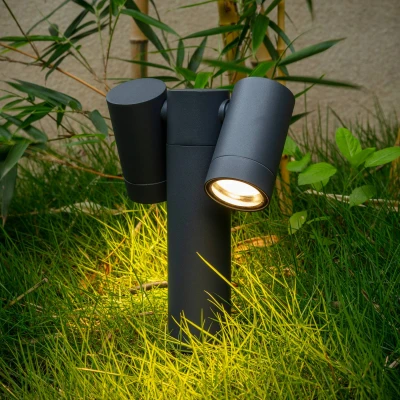 Lights.coTulimar ground spike light with two movable spots The Tulimar ground spike light proves to be extremely practical for outdoor use. With its two spots, which can be moved independently of each other, it can optimally illuminate the entrance area or garden path. Thanks to its IP code IP65, this spotlight can be used outdoors reliably over the long term. The dark grey surface finish blends in well with different environments without immediately attracting attention.