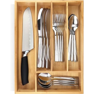 Pristine Bamboo Silverware Organizer Utensil for Kitchen Drawers Small Extra Deep Wooden Drawer Divider Spoons Forks Knives cutleries 5 Slots