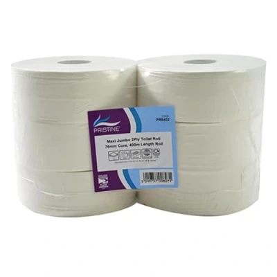 Pristine Maxi Jumbo White Toilet Tissue, 2 Ply, 76mm Core, 400m Length, Soft to Touch 100 Percent Recycled Pulp CHSA and FSC Accredited, UK Made (Case of 6 Rolls)