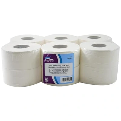 Pristine Mini Jumbo White Toilet Tissue, 2 Ply, 76mm Core, 200m Length, Soft to Touch 100 Percent Recycled Pulp CHSA and FSC Accredited, UK Made (Case of 12 Rolls)